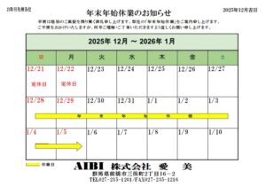 夏期休暇を8月12日(土)~8月16日(水)までお休みになります。大変ご迷惑をおかけいたしますがご理解ご了承くださいますようお願い申し上げます。尚、8月11日(金)山の日は、通常営業です。